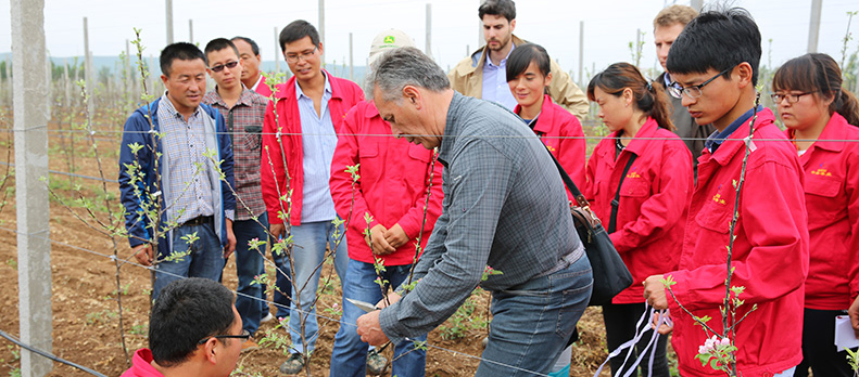 公司技术研发团队先后数次远赴欧洲实地考察,结合国际先进的栽培技术和管理方法共同打造中国技术最先进、规模最大、质量最优的现代化苹果产业示范基地。