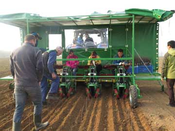 3月4-7日,在来自荷兰的技术工程师Mr. HendrikusHol, H.S.S.B.V等一行4人来到宝鸡华圣果业有限责任公司,对公司进口的苗木种植机进行了安装调试和技术培训。       苗木种植机为国内首次引进,是本次设备安装调试培训的重点。主要由操作平台、核心作业部件组成,其中核心作业部件可一次性完成种植过程中的开沟、种植、覆土、压实4道程序。具有操作简便、作业量大、作业质量高等特点。作业人员只需坐在平台的座椅上,就像插秧般,将手里的苗木放在不断闭合的两个滚动轮的缝隙间,几秒后,苗木就整齐地站立在了田间。该种植机作业时一个班组配备7名操作人员,每天可以种植苹果砧木8万株,大约是当地人工种植速度的10倍多。另外,设备自带的照明装置可以实现晚间正常工作。用该种植机定植的苗木具有横成排、竖成列、均匀紧实、深浅一致的特点,显著提高了种植的整齐度和成活率,有利于苗圃后期机械除草、打药、起苗等作业管理,为提高苗木出圃的商品性奠定了坚实的基础。       另外,公司引进的1500升牵引式风送喷雾机双侧喷幅可达近20米,每小时作业面积50-100亩。喷头流量和喷幅都可以进行调节。而与之配套的电子化控制的农药混合机大大缩短了喷药前的准备时间,有力地保障了植保机械化作业的效率。       经过这几天的设备安装调试培训和现场演练,公司上下对农业现代化和机械化有了更深刻的认识,同时对国外机械设备求实创新、精益求精以及人性化的设计制造理念有了直观的体会。该批进口果园机械的安装调试工作的顺利完成也标志着华圣果业在发展现代化种植业过程中,在实现果园全程管理机械化方面迈出了坚实的一步,如虎添翼,助力农业规模化经营。